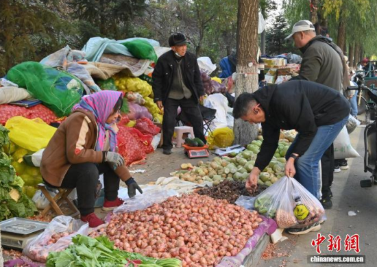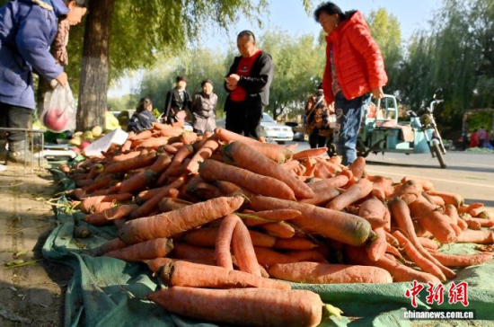 10月16日,吉林長春,市民在挑選胡蘿卜。當(dāng)下正是中國東北民眾“囤秋菜”的季節(jié),滿載大蔥、白菜、胡蘿卜等秋菜的貨車?吭陂L春市區(qū)指定銷售區(qū)域,市民們穿梭挑選,忙碌地儲(chǔ)備過冬秋菜。中新社記者 張瑤 攝