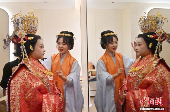 1月9日,吉林長春,任鴻洋(右)手持熏香入場。長春“00后”女孩任鴻洋是一位漢服愛好者,出于對傳統(tǒng)文化的熱愛,她成為一名執(zhí)禮喜娘。她已為50多對新人舉辦中式婚禮,通過優(yōu)雅的古典儀式,不僅推廣傳統(tǒng)婚俗,更致力于傳播漢服文化。她希望以年輕的方式,讓千年“中式浪漫”在現(xiàn)代生活中煥發(fā)新光彩。中新社記者 張瑤 攝